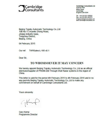 2015年2月4日,北京凌天正式成為英國劍橋cambridgeconsultants公司PRISM200穿墻雷達(dá)在中國的總代理