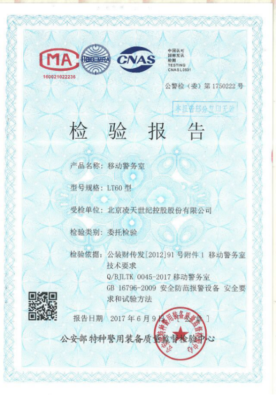 我司的移動警務室取得了公安部特種警用裝備質(zhì)量監(jiān)督檢驗中心的檢驗報告。