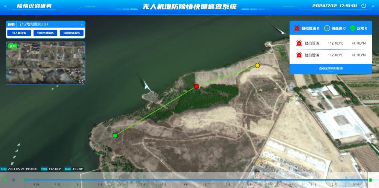 系統(tǒng)主要針對汛期堤防滲漏、管涌、塌陷場景進行快速排查隱患需求,以無人機搭載雙光相機匹配原理,結(jié)合人工智能辨識算法形式進行巡查;系統(tǒng)設(shè)計化繁為簡,具備GIS高清底圖,能夠展示村莊、河道名稱及經(jīng)緯度信息,數(shù)據(jù)支持一鍵處理,保障高效運行。