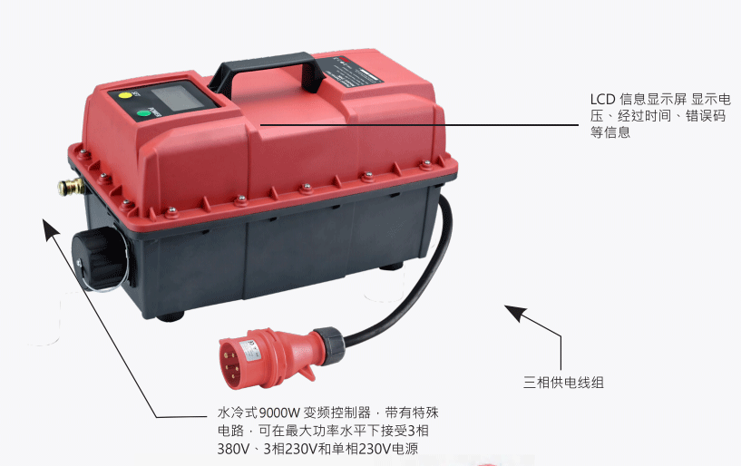 2、水冷式9000W變頻控制器,帶有特殊電路??稍谧畲蠊β仕较陆邮?相380V、3相230V和單相230V電源。