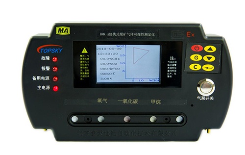 BMK-A便攜式煤礦氣體可爆性測定儀(以下簡稱測爆儀),是用于煤礦井下使用的礦用本安兼隔爆型攜帶式儀器。測爆儀用于煤礦井下,由礦山救護隊員攜帶進入災區(qū),監(jiān)視作業(yè)環(huán)境周圍氣體組份是否存在爆炸危險。也可由消火人員攜帶,在處理自然發(fā)火或啟封火區(qū)過程中,檢測周圍環(huán)境或密閉內(nèi)空氣中甲烷、氧的濃度值,在儀器液晶顯示屏上直接顯示出O2、CH4、CO的濃度值和環(huán)境溫度值,并顯示出“爆炸三角形”的圖形及各氣體組份所構成的坐標點,臨近或達到警界限時儀器同時發(fā)出聲、光警報。
