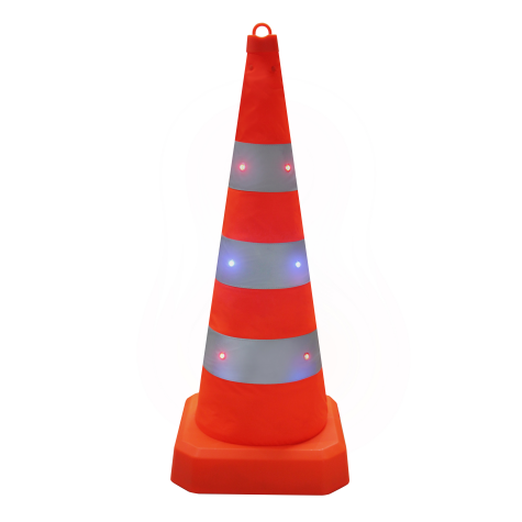 該發(fā)光路錐為LED發(fā)光伸縮路錐,高度通常為90cm,加頂燈高95cm,收納尺寸340340110mm,單重3kg。它采用300D防水防刮花牛津布材質,底座加大加寬,錐體重量集中在底部,穩(wěn)定性好,不易被風吹倒。具備常亮、快閃、慢閃三種發(fā)光模式,可在不同場景下按需切換,夜間警示效果好。