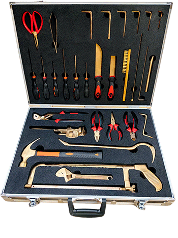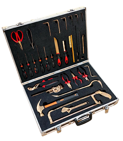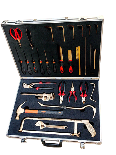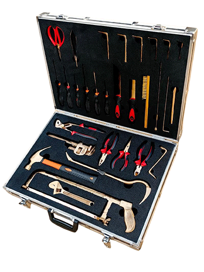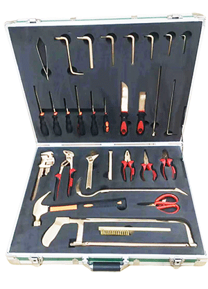 NMT-WA03型號無磁排爆工具組通常為36件套。工具由鈹青銅合金制成,裝在堅固的硬質(zhì)箱體內(nèi),箱內(nèi)有四個可拆卸嵌體,便于工具的分類存放與攜帶。