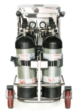 移動供氣源適用于在化工廠內(nèi)污染地區(qū)進行長時間的維修工作,或在缺氧地區(qū)工作。最大可在直徑為50 m的范圍內(nèi)工作,也可進入狹窄的空間作業(yè)。該裝置不可在水下使用。持續(xù)供氧時間取決于使用者的氣量儲備。